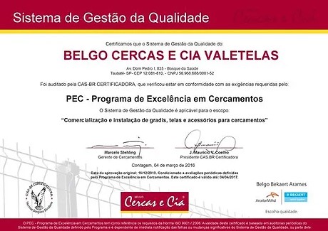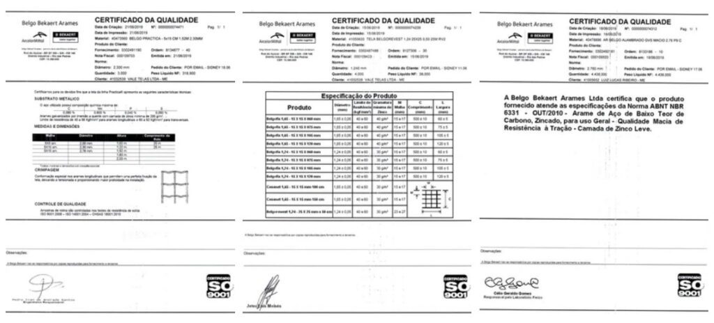 Todas as telas e cercamentos comercializados pela Vale Telas possuem Certificado de Qualidade emitido pela Belgo Bekaert, atestando a procedência e qualidade dos nossos produtos. A Belgo Bekaert segue padrões internacionais para fabricação de arames e possui um rígido controle de qualidade.